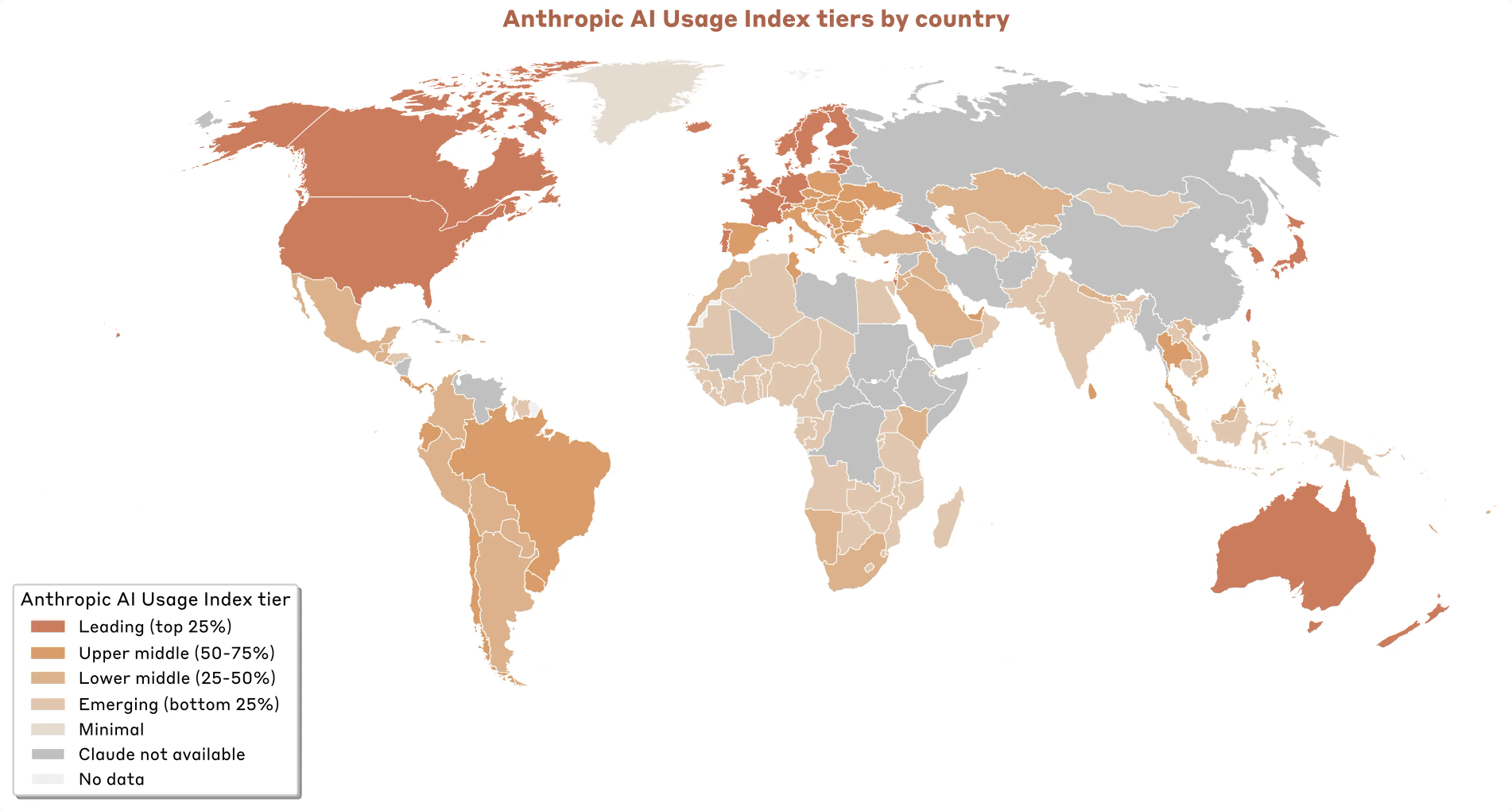 Anthropic’s Economic Index highlights a clear correlation: AI usage per capita rises with GDP per capita. Wealthy nations like Singapore, Israel, and South Korea are far ahead. Middle- and low-income countries lag behind, sometimes dramatically.