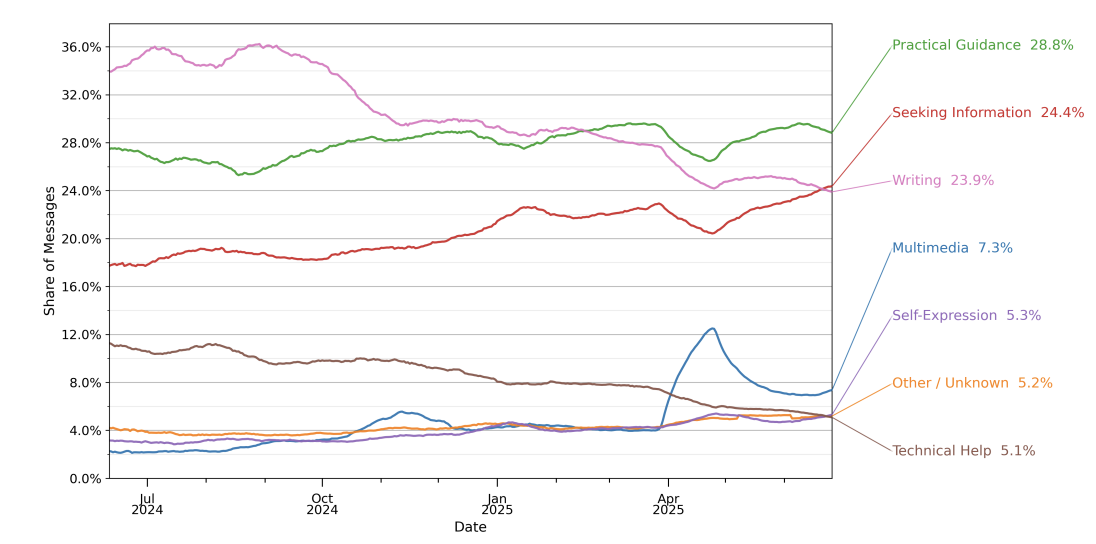 • OpenAI’s findings: Over 70% of ChatGPT use is non-work related. The most common tasks? Writing, information seeking, and practical guidance. In other words: essays, explanations, mail drafting, day-to-day support. Helpful, but low-stakes.