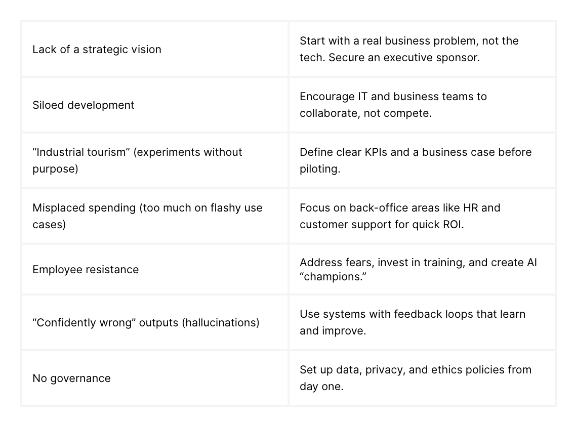 Even when projects are well-intentioned, technical issues like hallucinations derail trust. If employees spend more time fact-checking AI outputs than doing the task themselves, any ROI disappears.